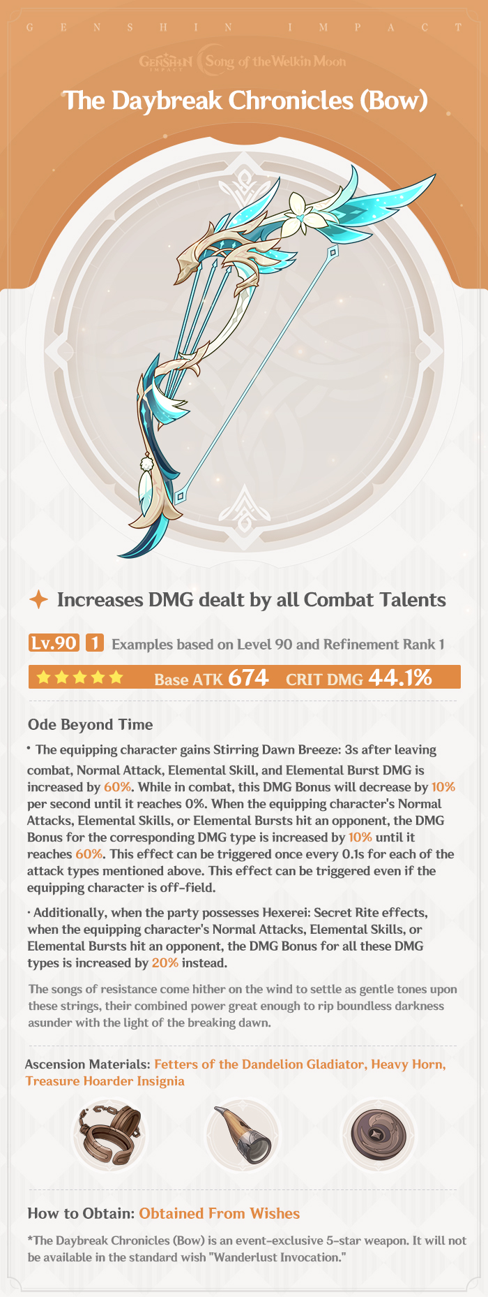 At maximum level, the 5-Star Bow The Daybreak Chronicles provides a 674 Base ATK and its secondary stat grants a 44.1% CRIT DMG Bonus.