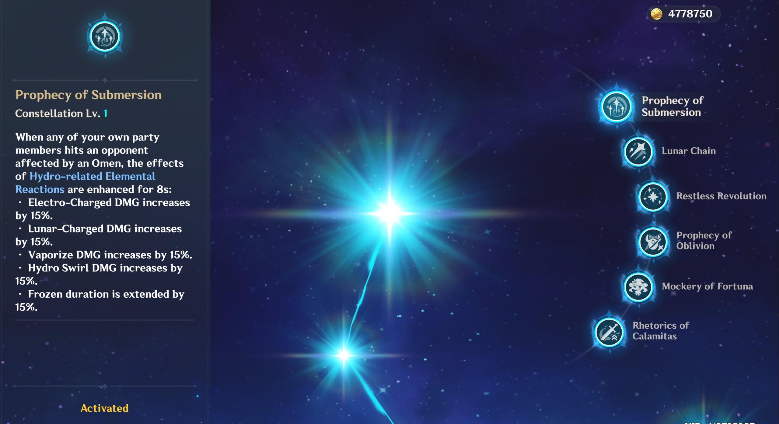Electro-Charged DMG increases by 15%, Lunar-Charged DMG increases by 15%, Vaporize DMG increases by 15%, Hydro Swirl DMG increases by 15%, Lunar-Crystallize DMG increases by 15%.