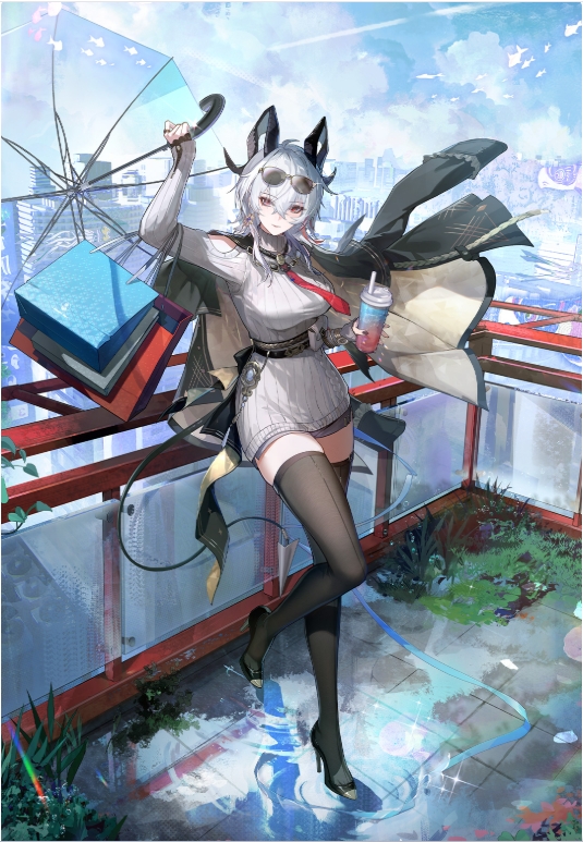 Turning slightly, Zani looks down at the city stretching beneath her. The afternoon sunlight spills over the buildings, their outlines shimmering in the glow. She gazes quietly, letting the city's clamor become the backdrop to this moment of ease."